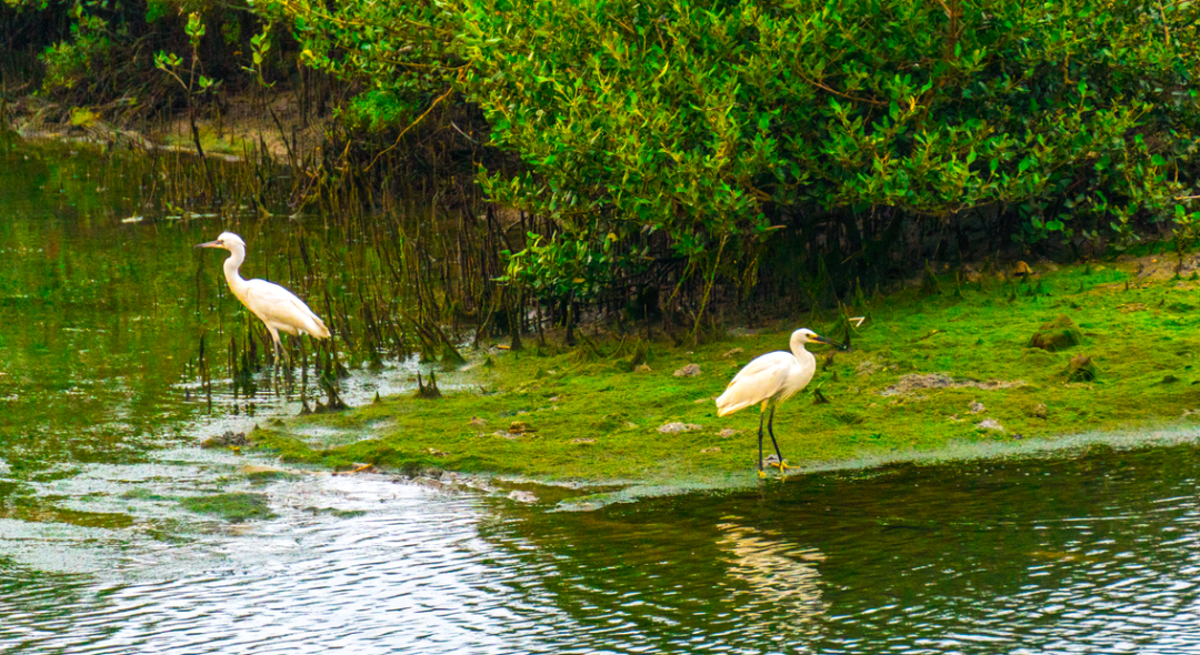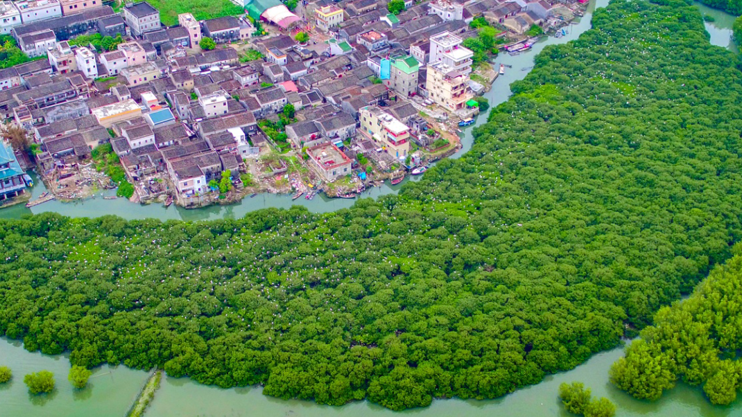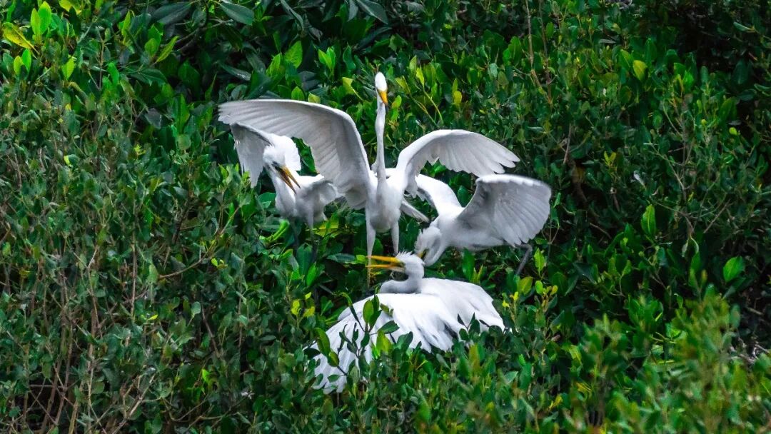 盐洲红树林内栖息了苍鹭、黄嘴白鹭、金斑行鸟等17种候鸟共计3万余只,每逢日落时分,万鸟归巢,气势磅礴,被网友誉为“鹭鸟天堂”。