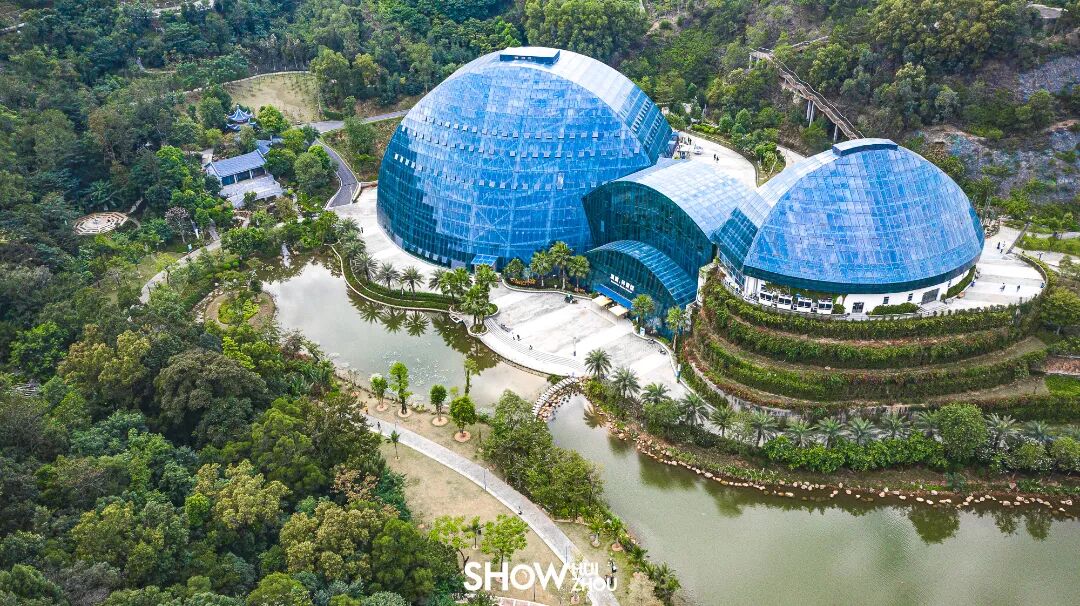 其中温室是园区内规模最大的建筑物,为钢结构玻璃幕墙建筑,呈半球形状,最高39米,当中热带雨林展区内部设有空中栈道、垂直绿墙、水景墙、景观水池、热带雨林植物等。
