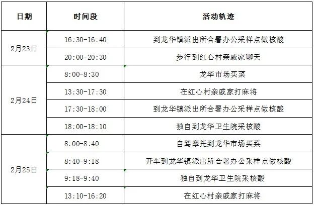 现公布一名涉疫地区的密切接触者在我镇的活动轨迹排查情况,如有市民在此时间段到过以下区域与密接人员存在同时空接触的,请按相应要求自觉落实防控措施并尽快到就近的核酸检测点开展1次核酸检测,往来途中请戴好口罩,避免乘坐公共交通工具,告知医务人员对应时间段的接触地点。为了方便周边的群众核酸检测需求,我镇将设置一个核酸检测临时采样点,具体如下: