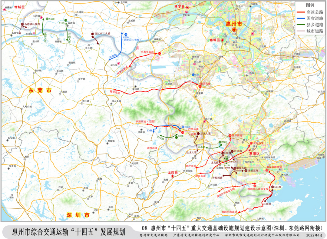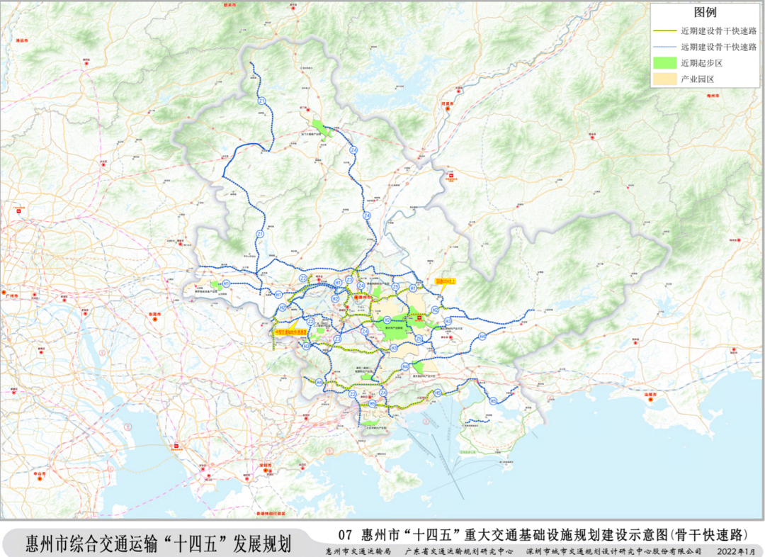 增强惠广、惠深、惠莞、惠河、惠汕、惠韶等通道能力,重点推进惠州与广州、深圳、东莞之间道路的规划建设。