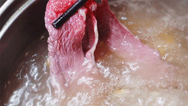 吊龙的纹路油花以黄金比例分布的,在锅里烫上十来秒,不用多久就能看见它的变成了诱人得肉色,闻着锅里一阵又一阵的牛肉脂香,在一旁等待的我早已忍不住流口水!