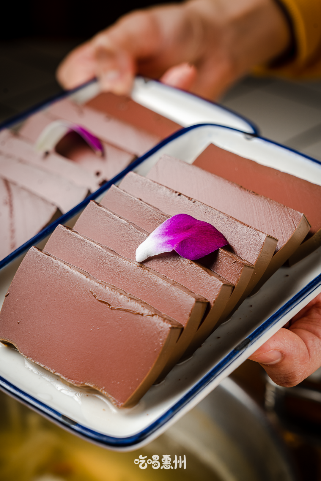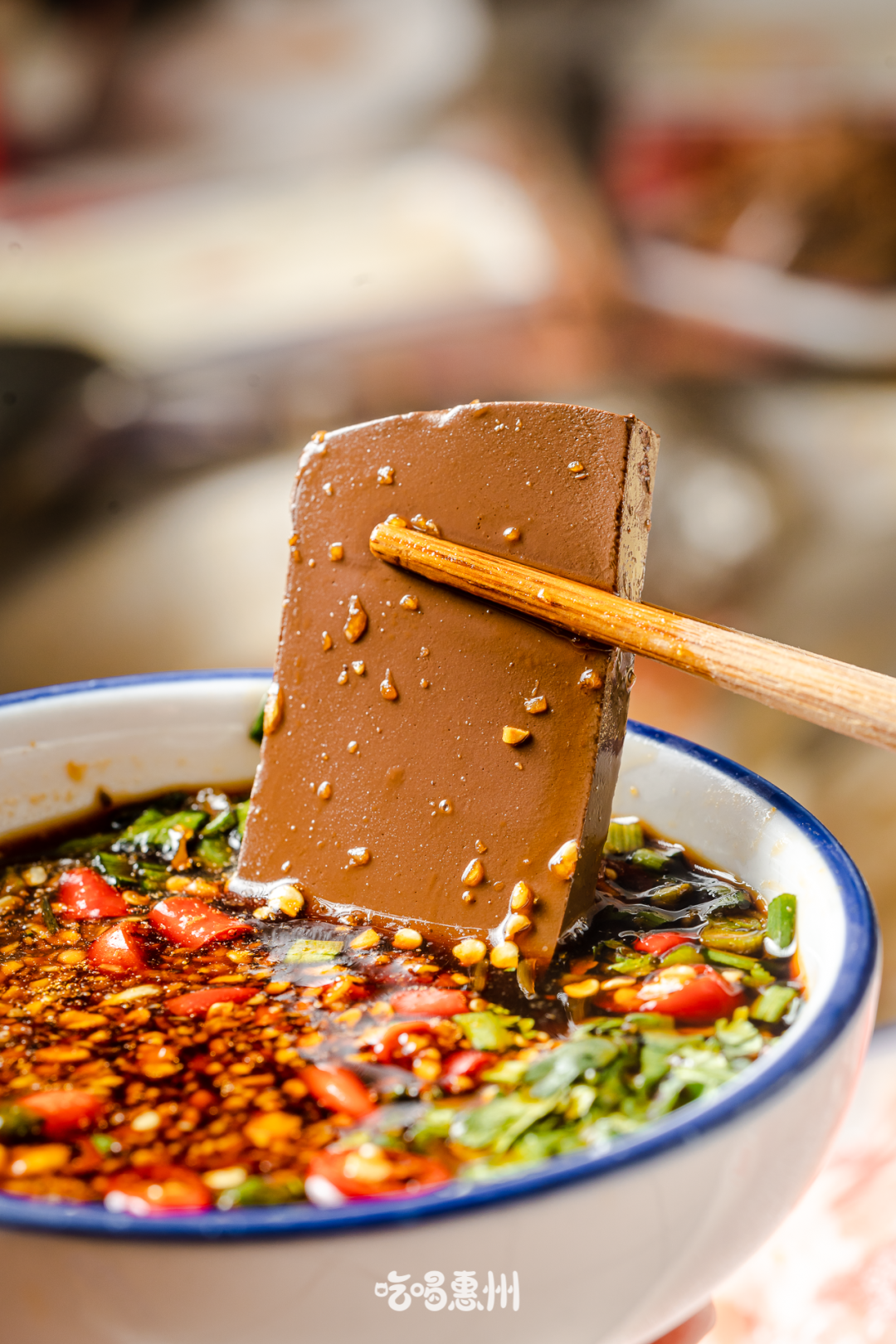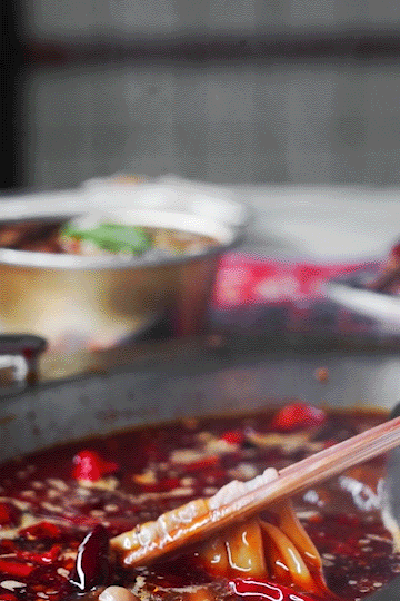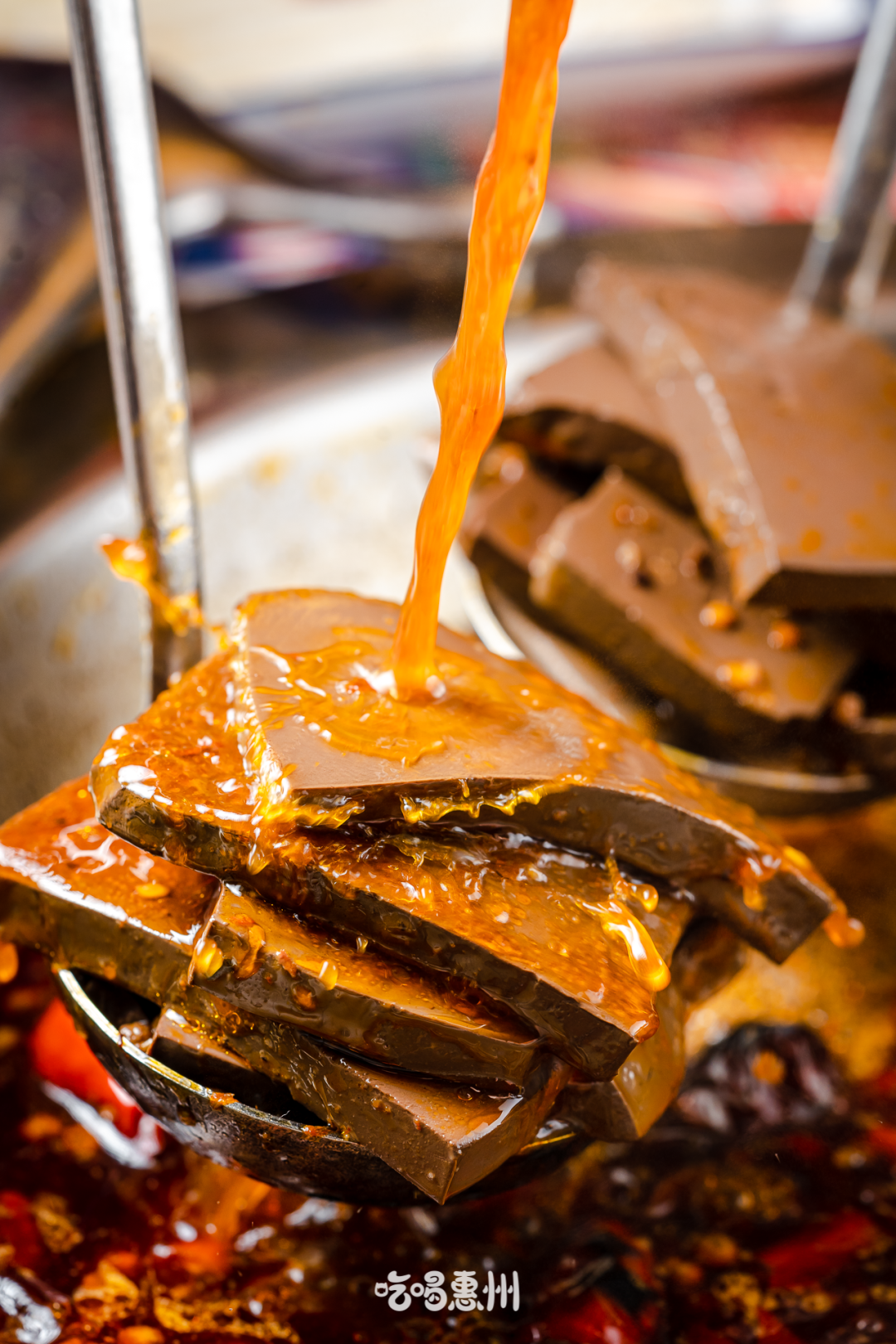经过红汤翻滚过的鸭血,麻辣弹爽、软嫩入味,蘸上蘸料更是过瘾。
