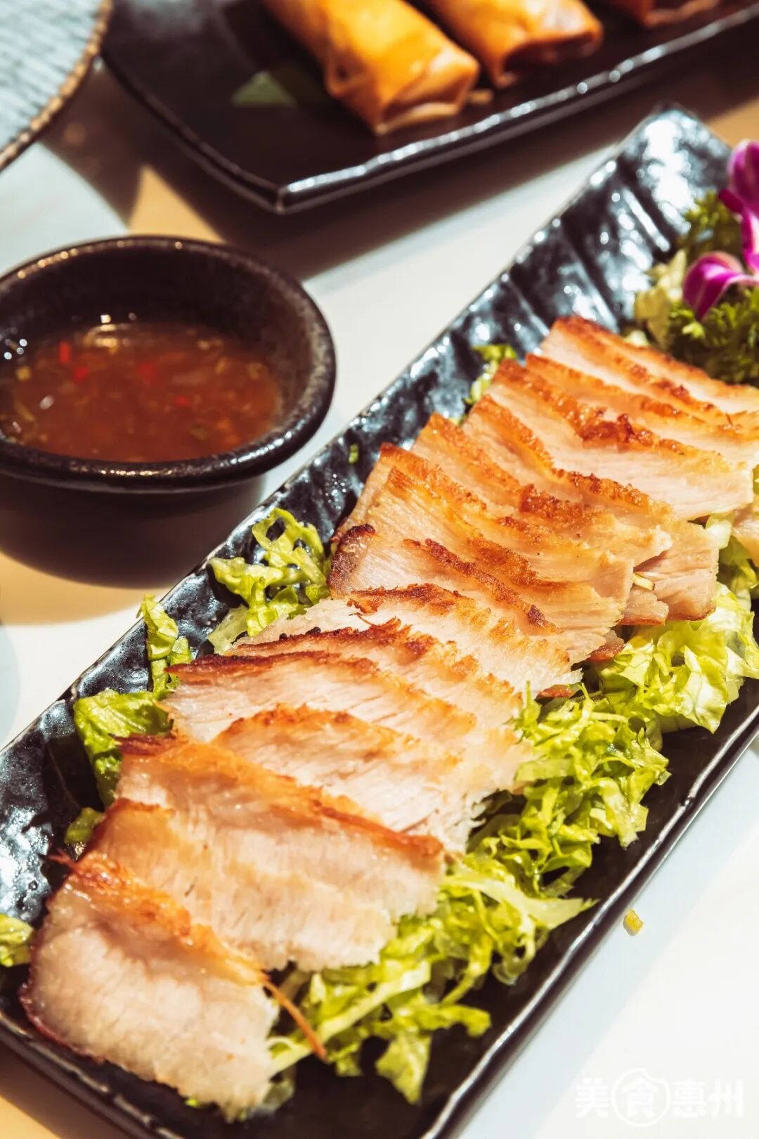 炭烧猪颈肉是去东南亚餐厅必点的一道菜,瘦而不柴的猪颈肉,表面烤至焦脆,入口柔韧而有嚼劲,焗过的肉汁香气充斥于口腔之中,爽口不肥腻!