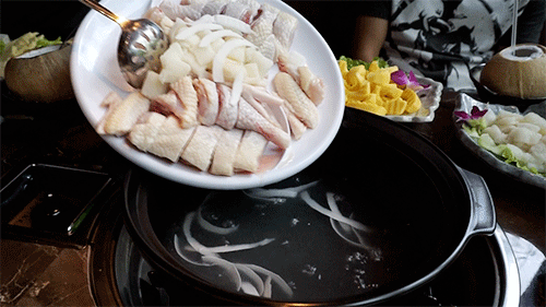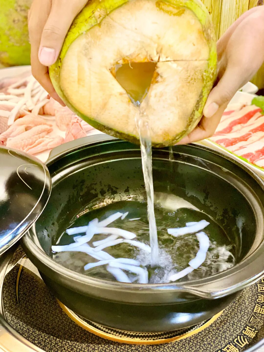 直接喝都很鲜美的椰汁,用作锅底,能让食材越煮越香。当锅底沸腾,食材翻滚,水蒸气弥漫,期待鸡肉和椰汁的一口鲜香之气。
