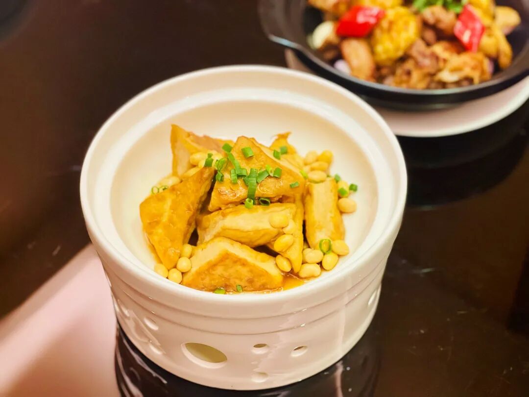 磨豆汁,做豆腐,酿肉末,一道道复杂的工序都是厨师们亲手完成,酿豆腐煎得表面微焦,内里依然很细嫩,碰上这金黄香嫩的煎酿豆腐,忍不住吹几口气,便呼哧呼哧大口吃下。