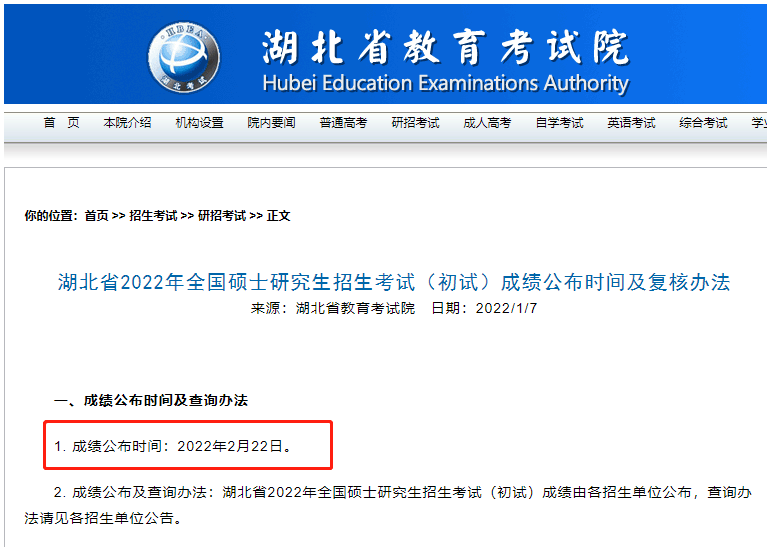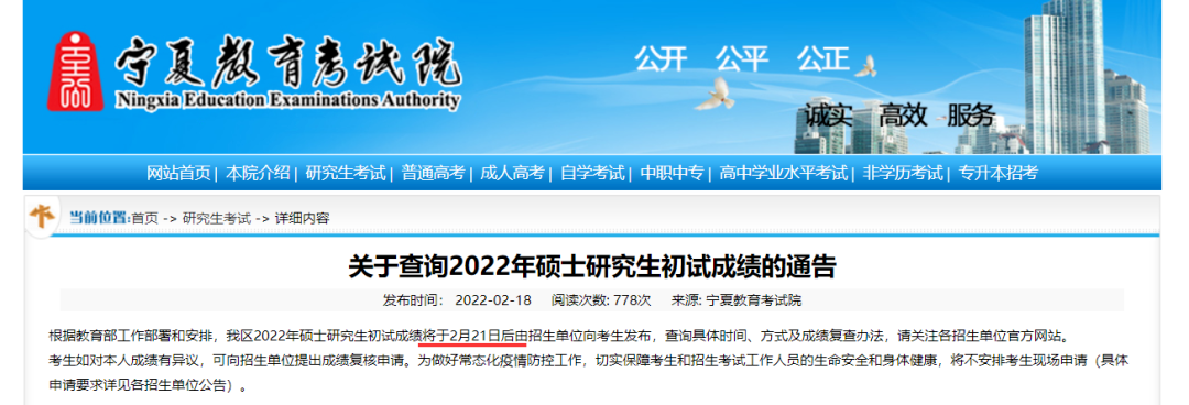 根据教育部2022年全国硕士研究生招生考试(初试)工作安排和要求,我省2022年全国硕士研究生招生考试(初试)成绩将于2月21日12:00后开通查询。