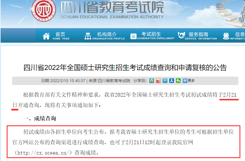 四川省2022年全国硕士研究生招生考试初试成绩将于2月21日开通查询。