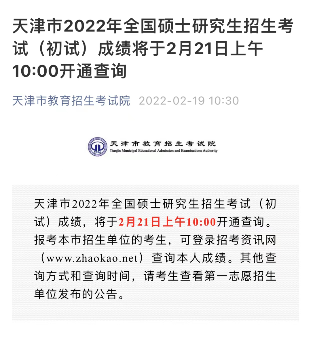 天津市2022年全国硕士研究生招生考试(初试)成绩,将于2月21日上午10:00开通查询。报考本市招生单位的考生,可登录招考资讯网(www.zhaokao.net)查询本人成绩。