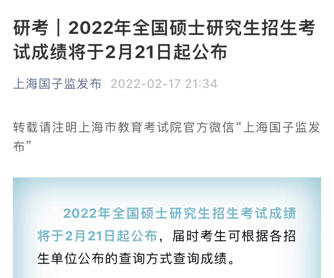 报考我省硕士研究生招生单位考生的2022年全国硕士研究生招生考试初试成绩将于2022年2月21日上午10:00公布。