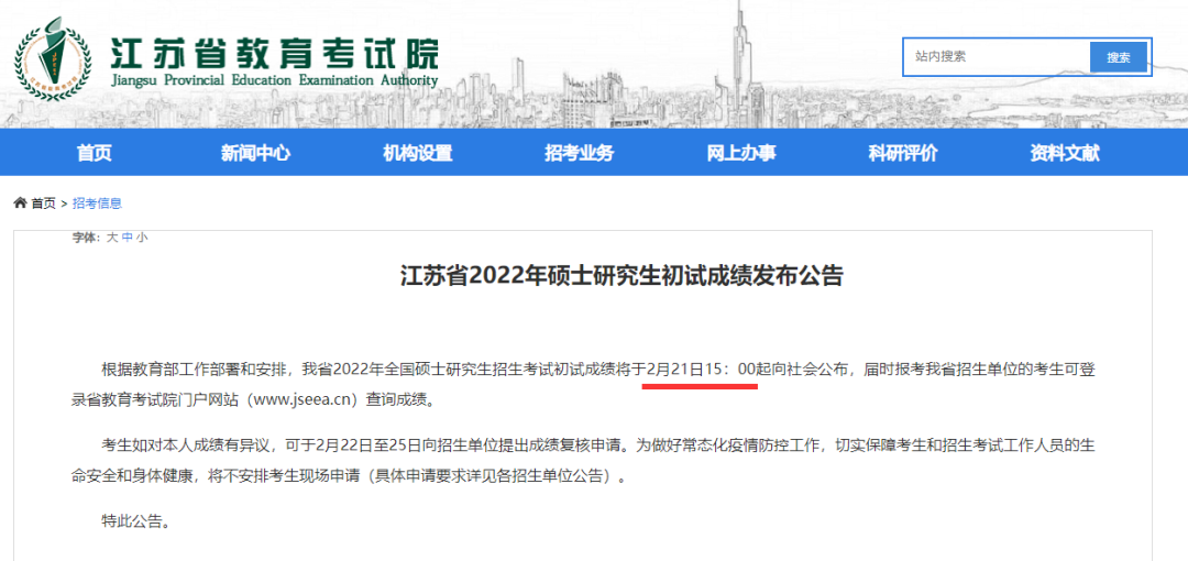 江苏省2022年全国硕士研究生招生考试初试成绩将于2月21日15:00起向社会公布。