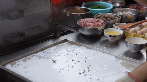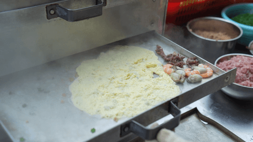 阿叔用熟练的动作重复做着一份又一份肠粉,蒸笼周边弥漫满了热气,给这条街的夜晚渲染了尽是人间烟火气的氛围。普宁肠粉相对广式肠粉而言会更加多料一些,看着阿叔一把一把地加料,小莓的口水都咕咕吞了。
