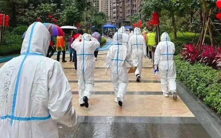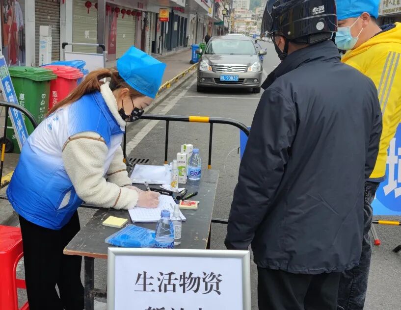 为保证街坊们封控期间正常生活,打通管控区配送“最后一米”,社区工作人员身穿防护服,通过线上接单、线下运送的方式,为街坊们配送物资。
