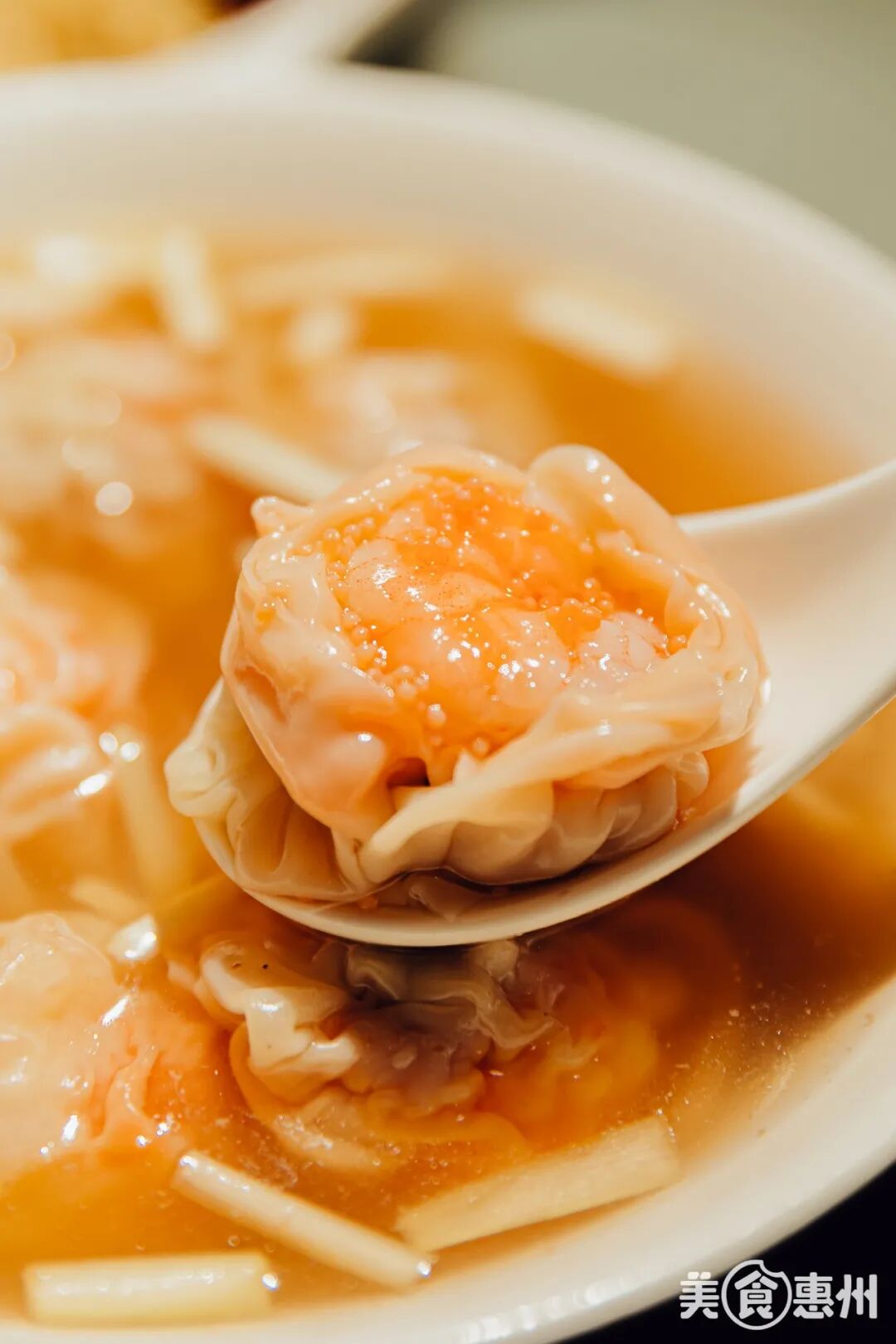 圆润透亮的云吞里是一整个饱满的鲜虾、蟹籽还有一些猪肉,光看这个用料就知道非常实在了。