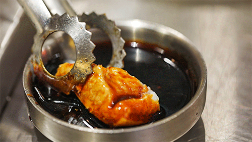 开烤之前,将鳗鱼蘸上浓郁的秘制酱汁,鱼皮在高温的炙烤下慢慢蜷缩起来,表面也逐渐变得金黄,并发出”滋啦”的响声,还没吃就已经被这香气诱的直流口水。