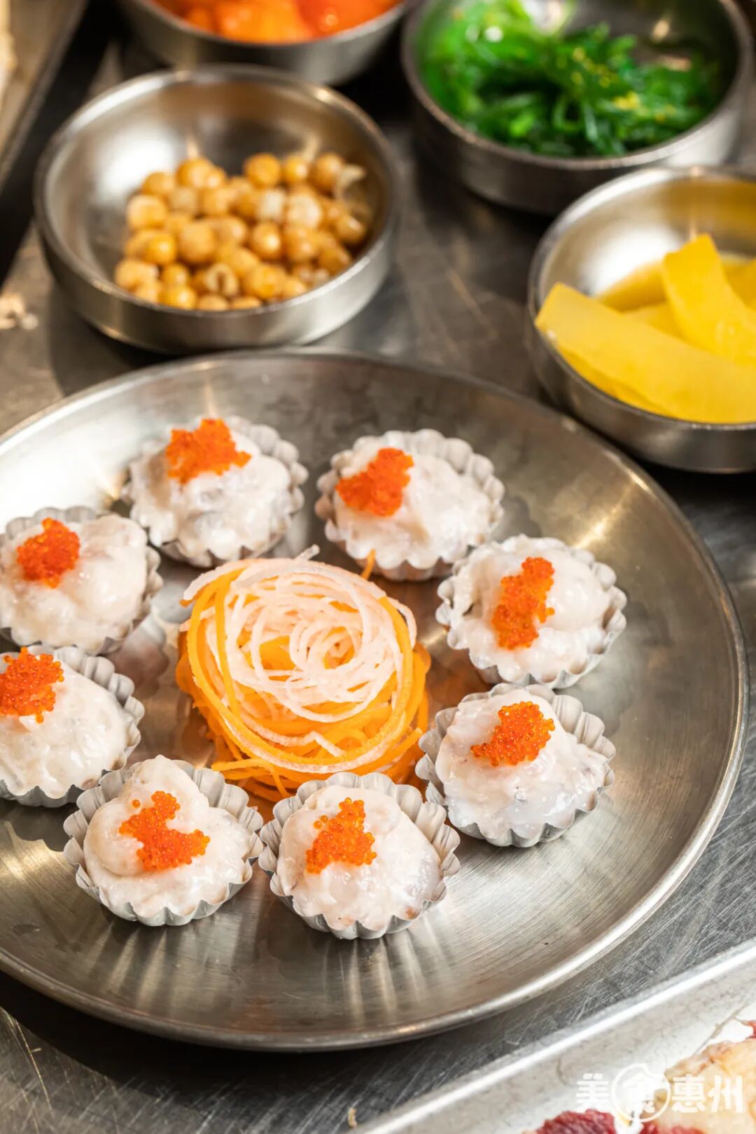 虾滑控看过来!会在嘴里”爆炸”的虾滑你吃过吗?虾滑顶上的颗颗蟹籽起到了增鲜的作用,入口还会爆开,弹牙十足的虾滑透着丝丝甜味儿,太令人着迷。