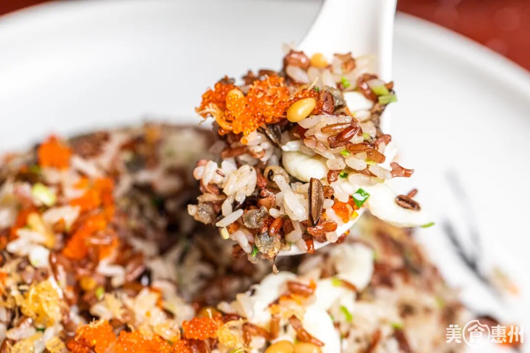 用红米混合着瑶柱、蟹籽、青豆、松子等超多配料翻炒而成的红米瑶柱炒饭,是店里新推菜式中的“彩蛋”,由主厨们精心研制而出~