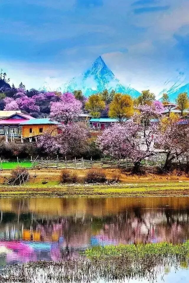 妖娆婉约的粉红色桃花,依偎在湛蓝的云天和磅薄的雪峰脚下,这刚与柔的美妙结合,让林芝显得更加的超凡脱俗,美不胜收。