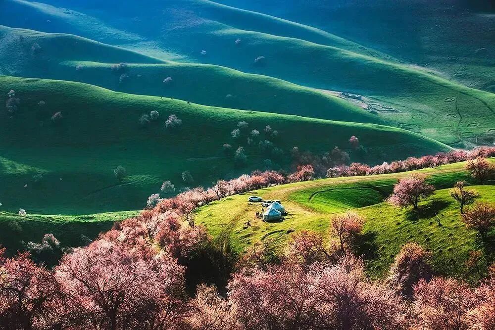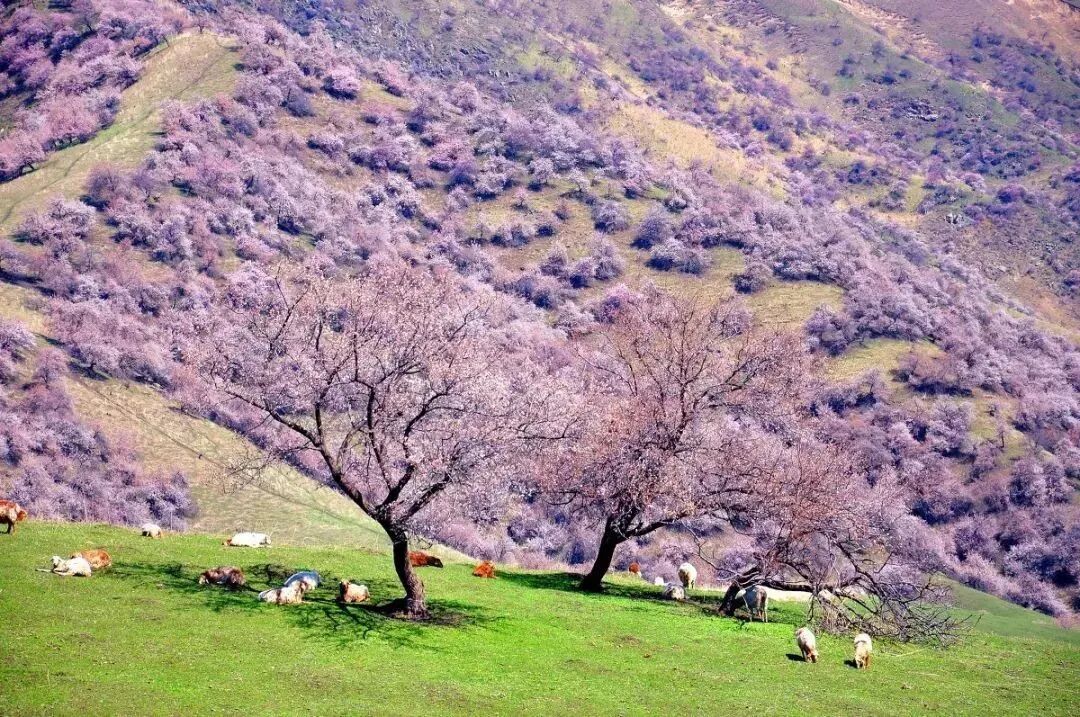 进入暮春四月,新疆伊犁河谷,野杏花惊艳盛开,一团一团的粉色,犹如燃烧的云朵镶嵌在天山腹地初绿的草原上。