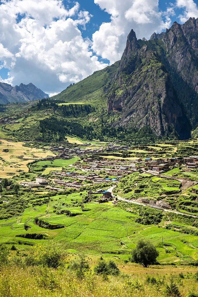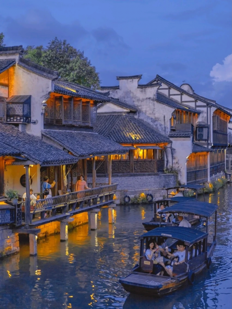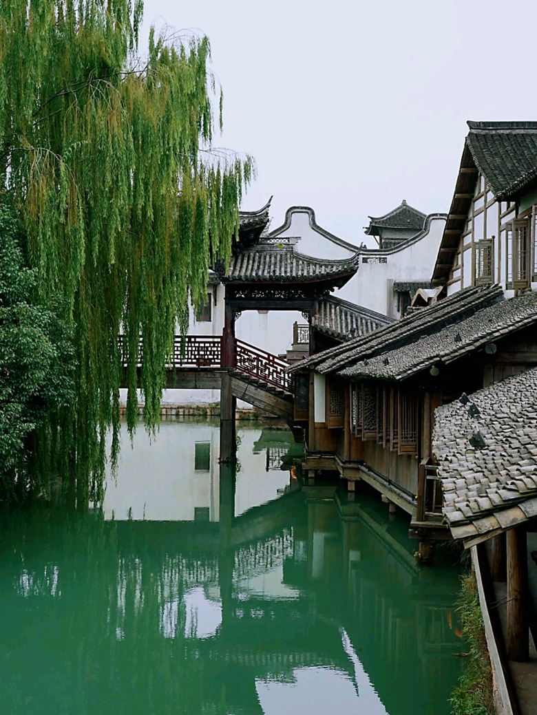 在乌镇,乌黑色建筑与青绿相间的自然风光相结合