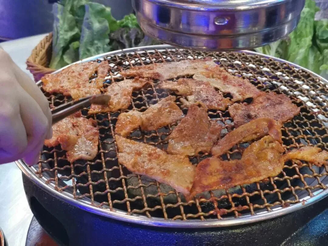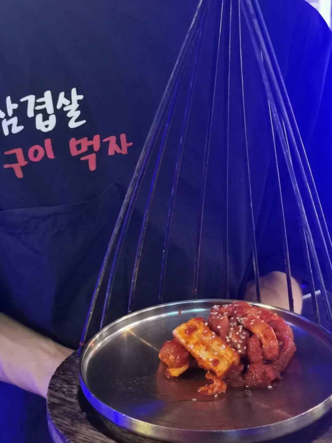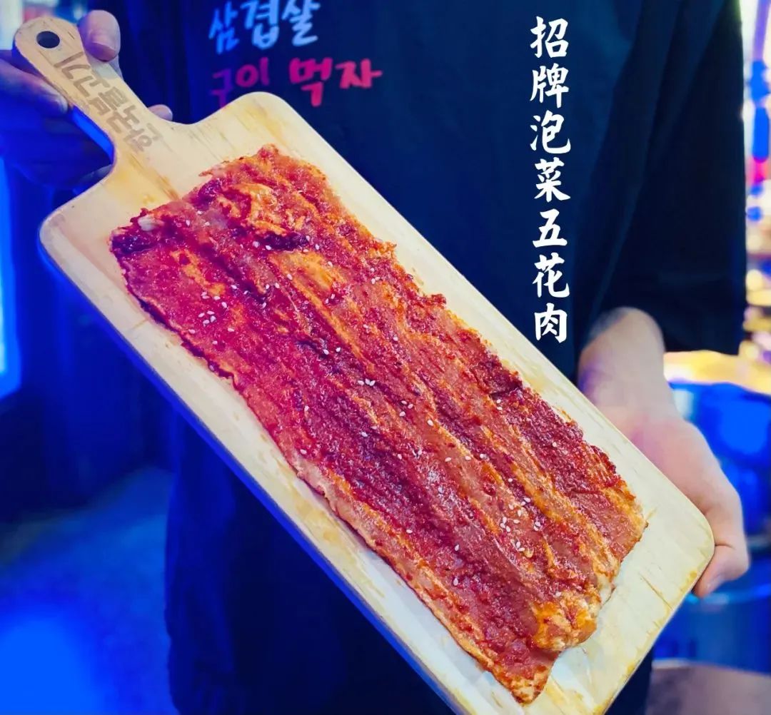 招牌泡菜五花肉是当家的花旦,人手都要入的一道菜。腌制过的五花肉烤好后可以直接吃就很美味,还可以蘸上老板自制的蘸酱又是一番风味。