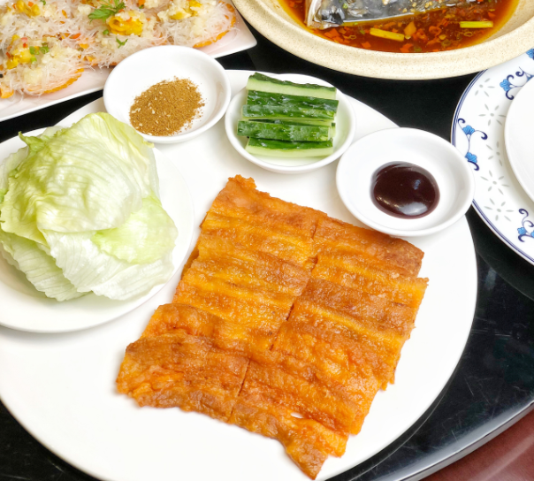 类似北京烤鸭的吃法,优选土猪,取四方腩肉(五花腩中间部位),特制烤成,然后青瓜生菜包肉,沾上美味烤肉酱和孜然,这酥脆口感,青瓜生菜清爽解腻,让人吃了会上瘾