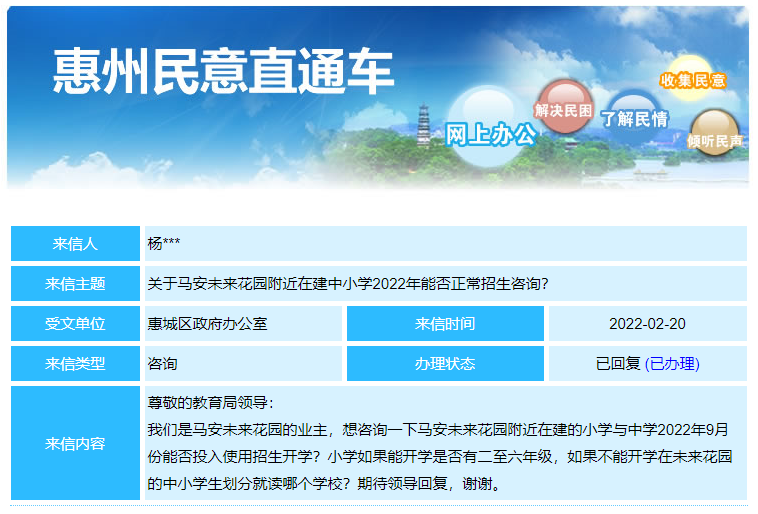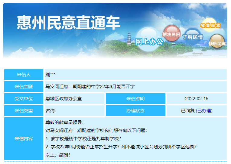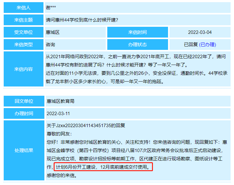 最近,有网友在惠州民意直通车上咨询该学校的建设进度。