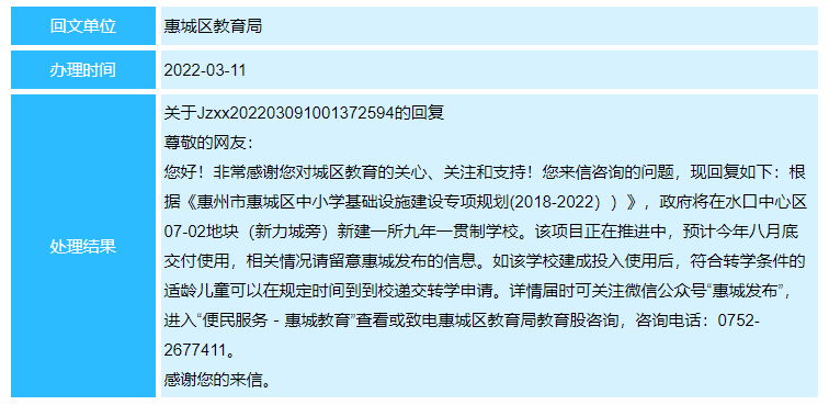 据惠城区教育局3月11日的回应,该学校将于今年6月份开工建设,12月底前建成交付使用。