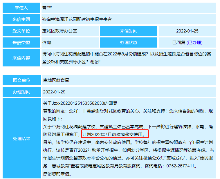 对此,惠城区教育局进行了回复,表示预计今年八月底交付使用。