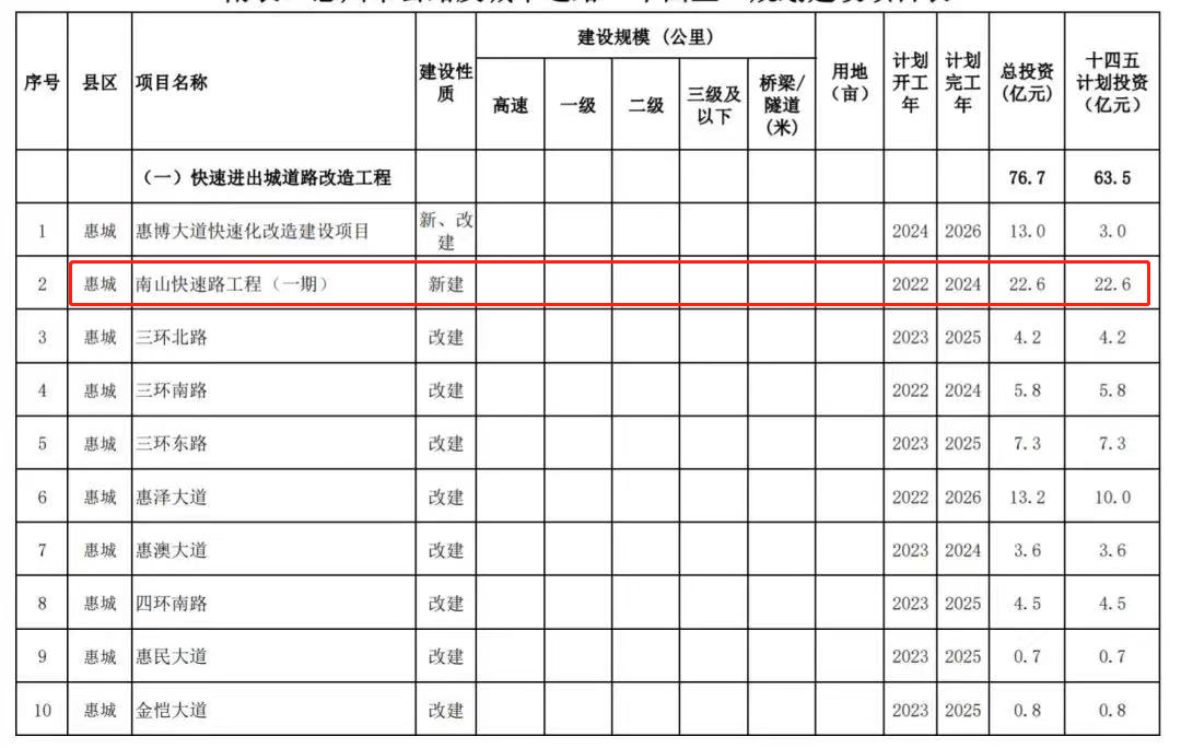 早在去年,南山快速路(一期)已陆续启动设计招标、土地征收等相关工作;今年1月,惠州2022年重点建设项目名单公布,南山快速路(一期)也在其中,还透露了总投资22.6亿元,计划2022年开工、2024年完工等信息,但有关施工的事项迟迟未提上日程。