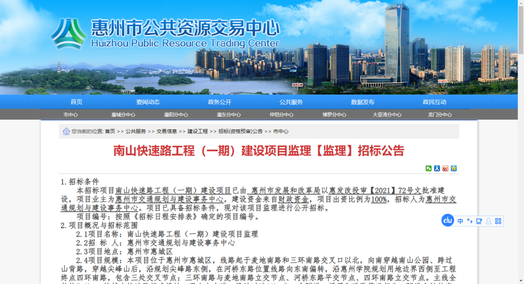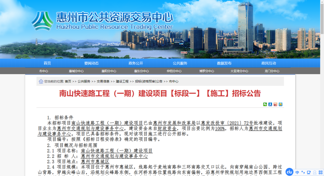 而就在近日,惠州公共资源交易中心接连发布了南山快速路工程(一期)建设项目【施工】/【监理】两个招标公告,这意味着南山快速路正式进入施工筹备阶段。