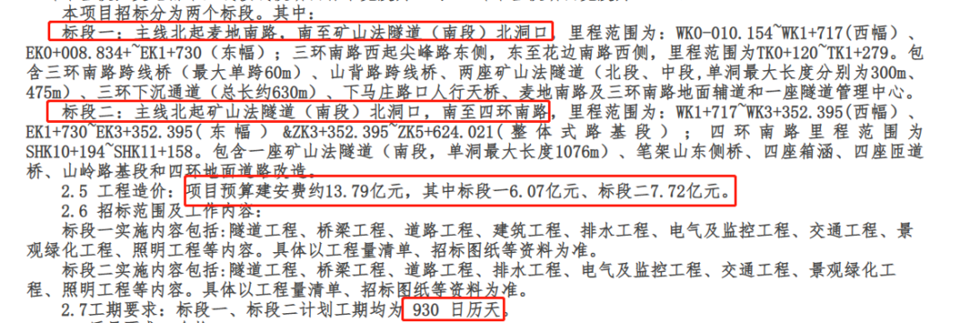 标段二:主线北起矿山法隧道(南段)北洞口,南至四环南路,预计造价7.72亿元,包含一座单洞最大长度为1076m的隧道及其他施工项目。