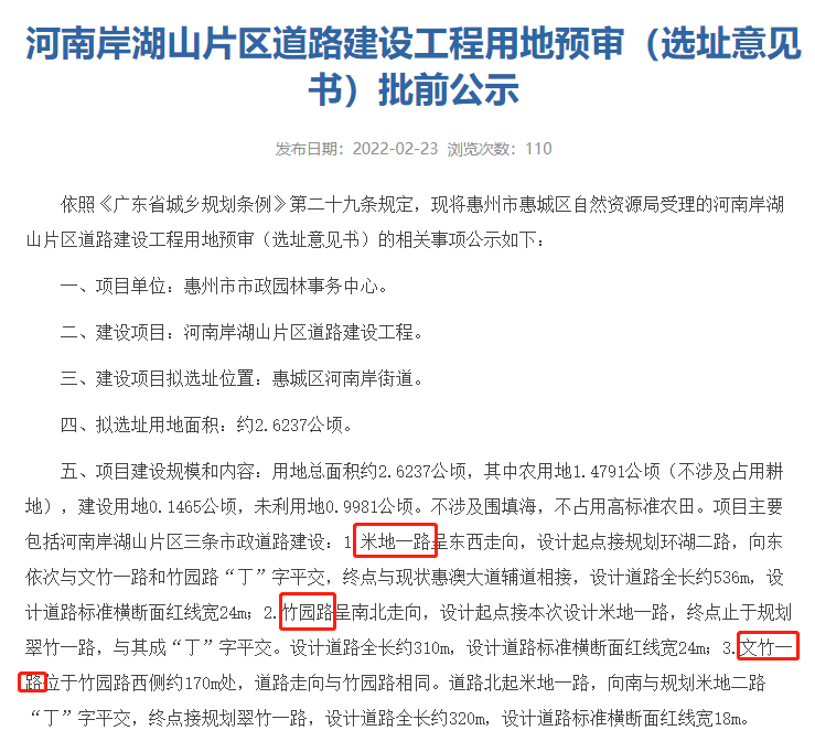 米地路、文竹路、竹园路,这3条位于惠州天安数码城范围内的道路,早在去年7月已启动设计招标,此次发布建设批前公示,意味着这3条路不久将开始施工。