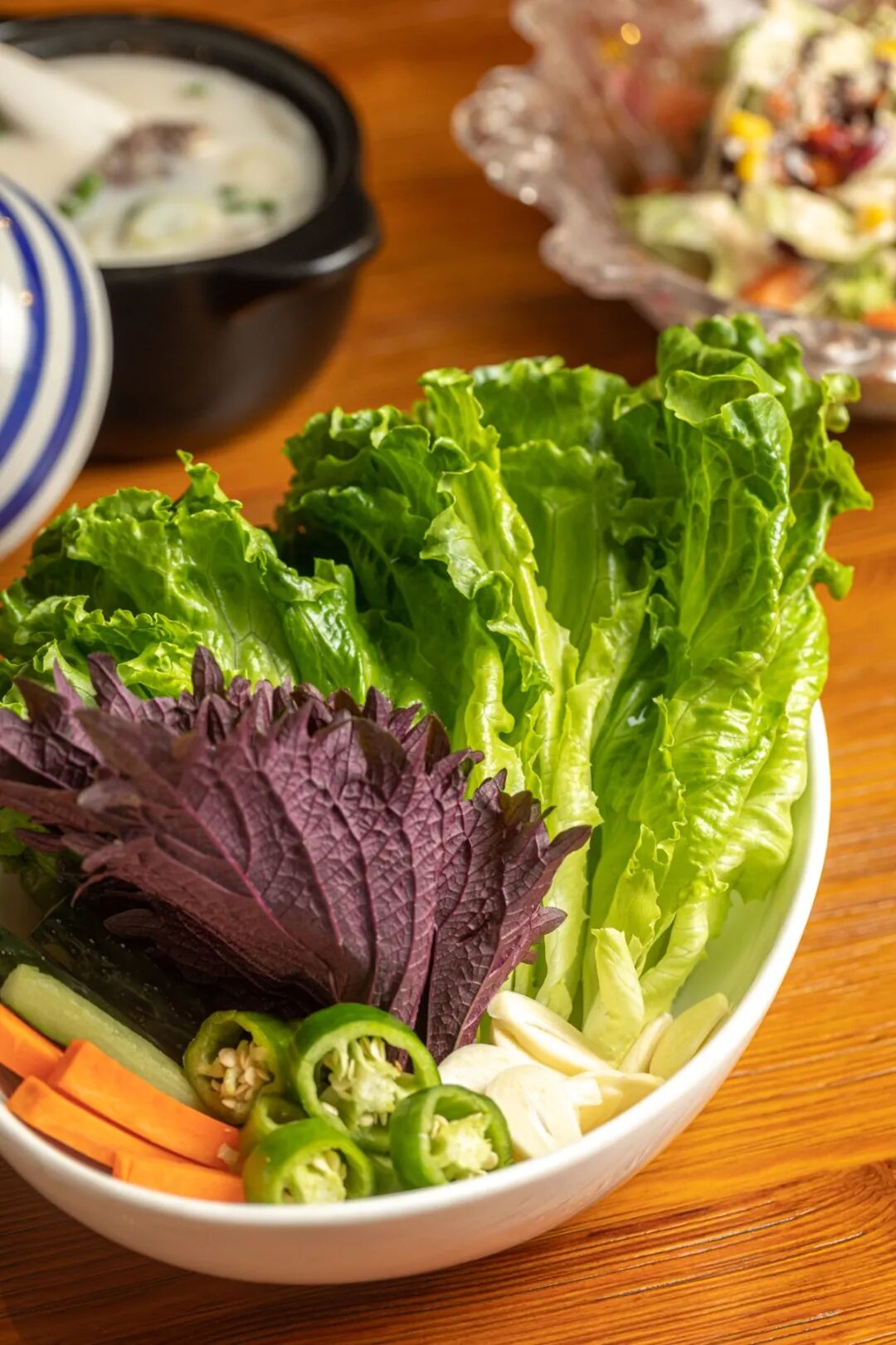 肥牛的知名度估计已经高到不需要我多说了。它在烤盘上“滋”“滋”地散发出独有的油脂香,估计没人能把控得住自己吧?夹几片蒜片和青椒段一起包在生菜里,简直不要太好吃!