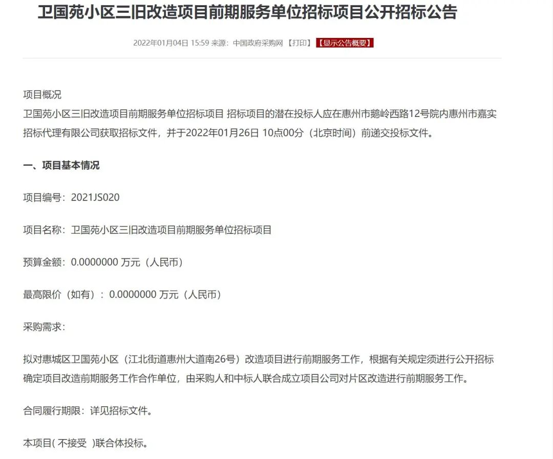 2022年1月4日,中国政府采购网发布《卫国苑小区三旧改造项目前期服务单位招标项目公开招标公告》。