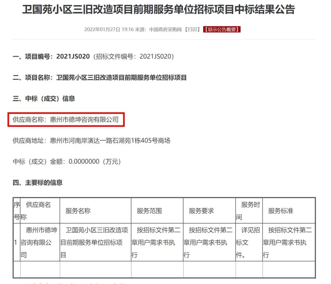 2022年1月27日,《卫国苑小区三旧改造项目前期服务单位招标项目中标结果公告》在中国政府采购网发布,项目中标人为惠州市德坤咨询有限公司 。