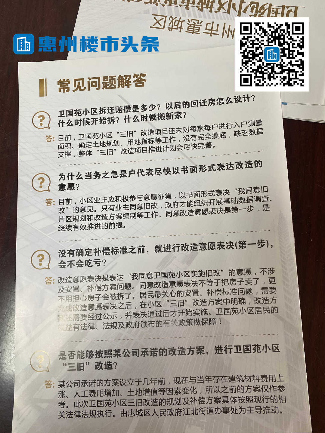 据了解,改造意愿表决是表达居民同意卫国苑小区实施旧改的意愿,不涉及安置、补偿方案问题,居民最关心的安置、补偿标准问题,需要等改造意愿表决之后,在小区“三旧”改造方案中明确,改造方案还需要经过公示,并表决通过后才开始实施。