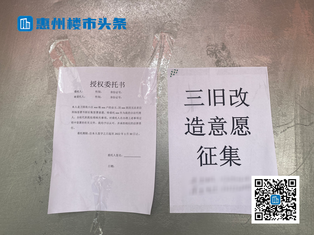 卫国苑小区三旧改造项目指挥部就设立在小区内部,门上粘贴《委托授权书》以及《三旧改造意愿征集》,楼叔到访当日,可以看到时不时有小区居民过来签署意愿征集书。