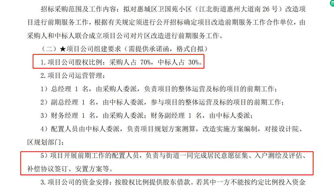 也就是说,卫国苑小区三旧改造将由政府牵头,由采购人惠州市建功投资开发有限公司和中标人惠州市德坤咨询有限公司联合成立项目公司对项目改造进行前期服务工作,负责与街道一同完成居民意愿征集、入户测绘及评估、 补偿协议签订、安置方案等。