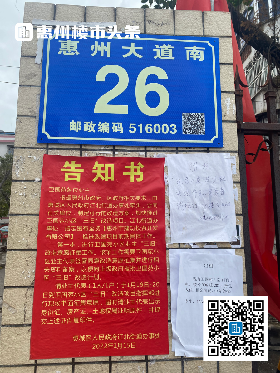2021年10月,惠州市政府批准同意将卫国苑小区纳入“三旧”改造计划,并由惠城区政府江北街道办事处牵头,依法依归推进小区的升级改造工作。