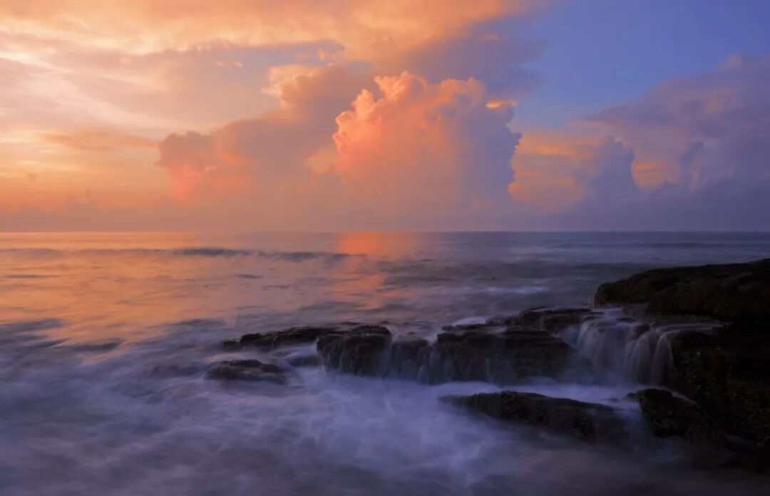礁石在夕阳的光辉下营造出