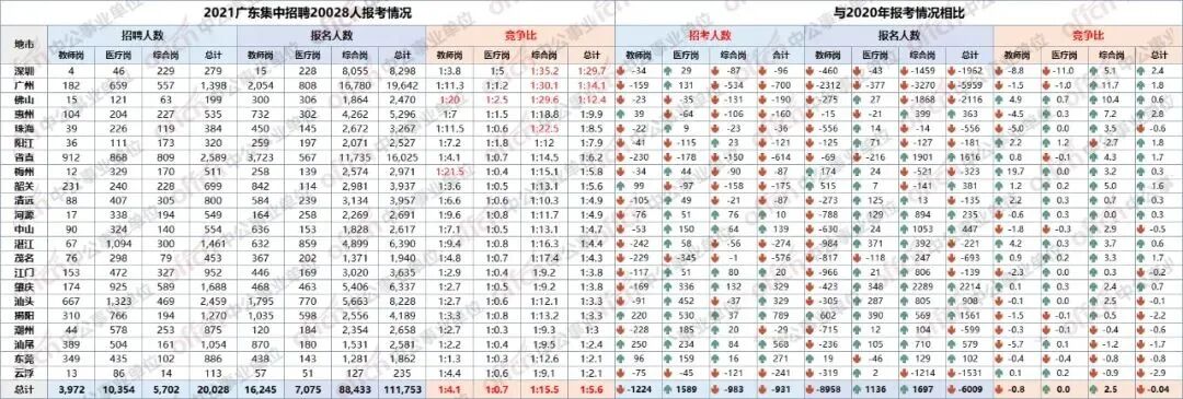 从2021年集中招聘招考报名情况来看,招考规模达20028人,但报名人数111749人,其中综合岗竞争较大也只有35:1,甚至广州、深圳、省直这一类的热门地区平均竞争比较高的也只有30:1。