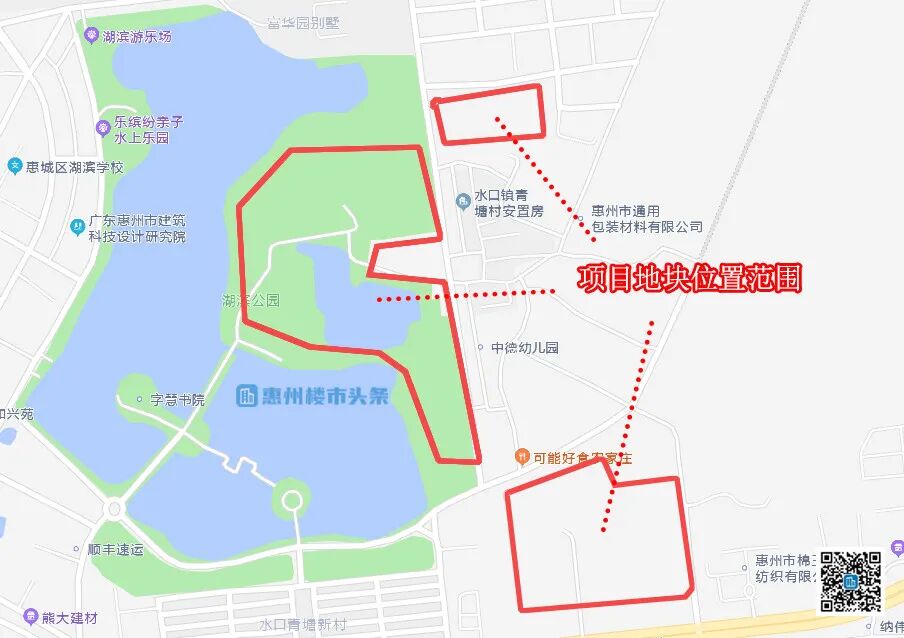 从项目的西侧看,贴近项目现建设地块的是惠泽工业园,然后是水口青塘新村和湖滨公园。