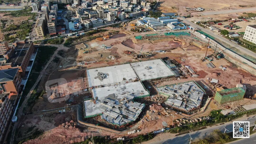 通过航拍,可以看到临近惠泽大道的地块现场已在施工中,地块整体已做完地基,铺平了地面,临近大道的位置已有两栋楼正在建设地面一层。