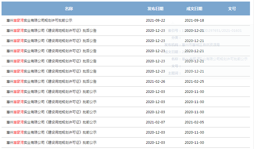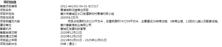 项目备案中的惠州惠豪湾实业有限公司,实际就是由碧桂园全资控股的子公司。