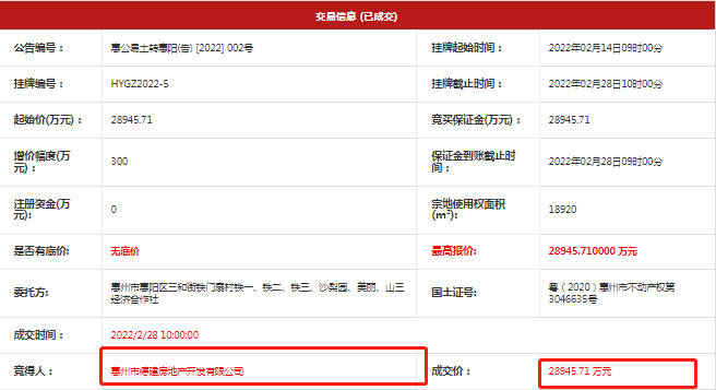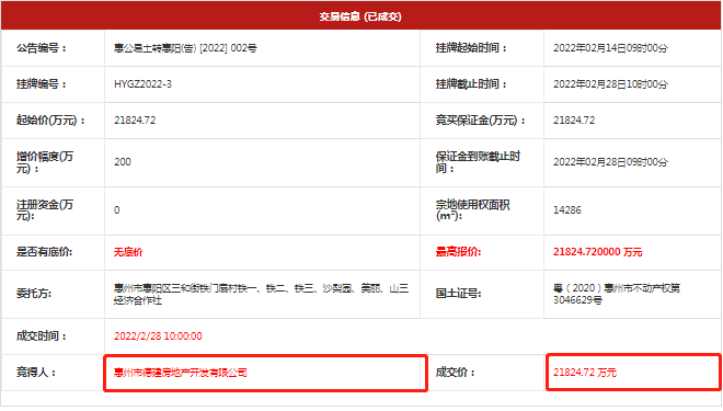 今日(2月28日)出让的惠州市惠阳区三和3宗商住用地均成功出让。