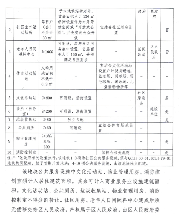 文化活动站、公共厕所、垃圾收集站、物业管理用房、消防控制室不得分割转让。社区用房、老年人日间照料中心建成后须无偿移交给区人民政府。