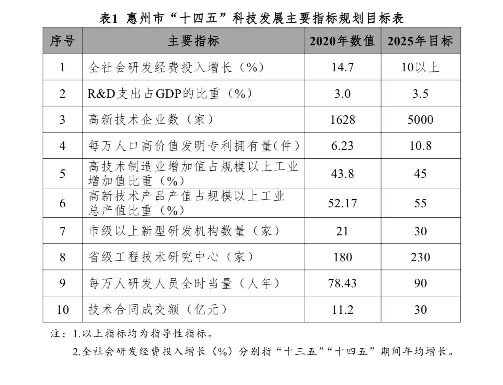 立足科技发展新基点,《惠州市科技创新“十四五”规划》提出,到2025年,全市科技创新能力显著提高,主要科技指标实现显著提升,基本建成具有示范引领带动作用的创新型城市,成为支撑科技创新强省建设的重要力量。其中,全社会研发经费投入年均增长10%以上,R&D占GDP比例达到3.5%;