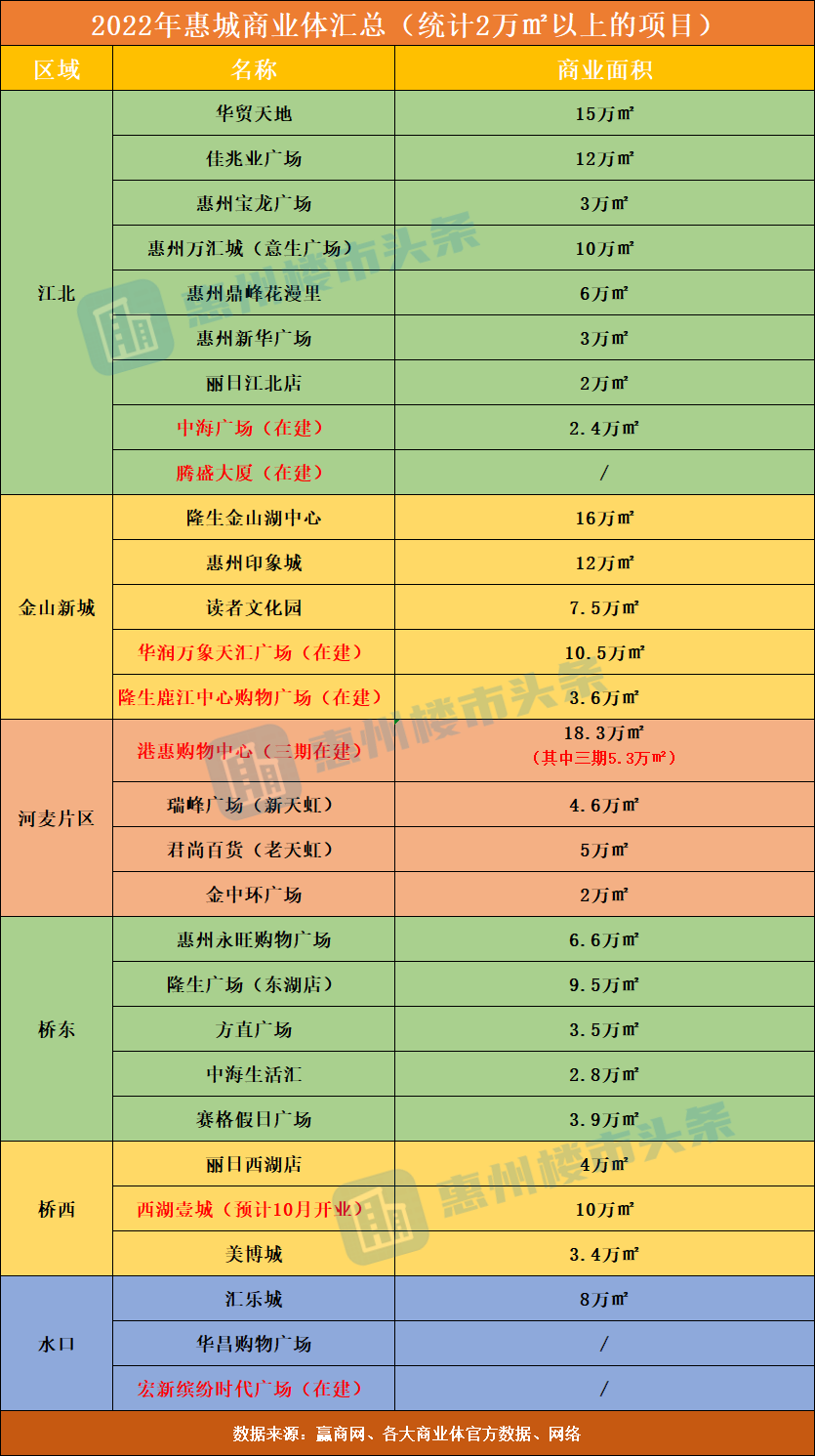 据不完全统计,目前惠城区已有23个已开业商业项目(≥2万㎡),数量为惠州全市之最。与此同时,区域还有众多规划的商业项目,其中在建的商业综合体(≥2万㎡),就有7个,主要在江北和金山新城。