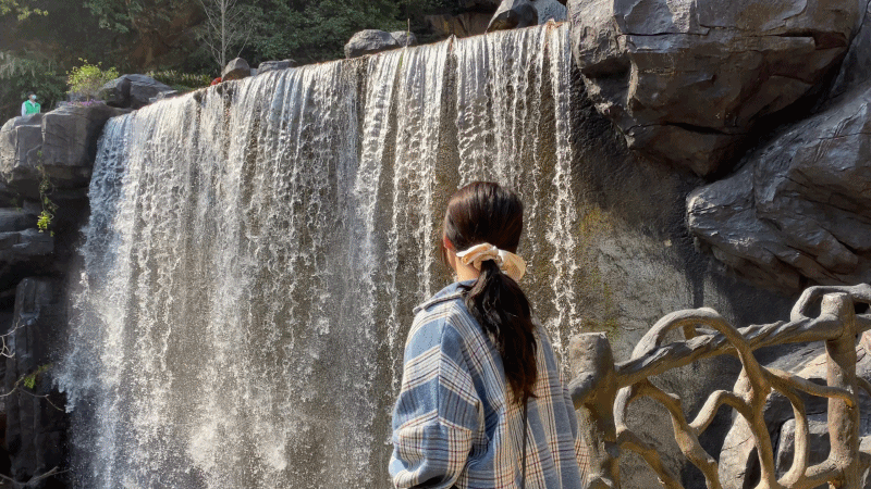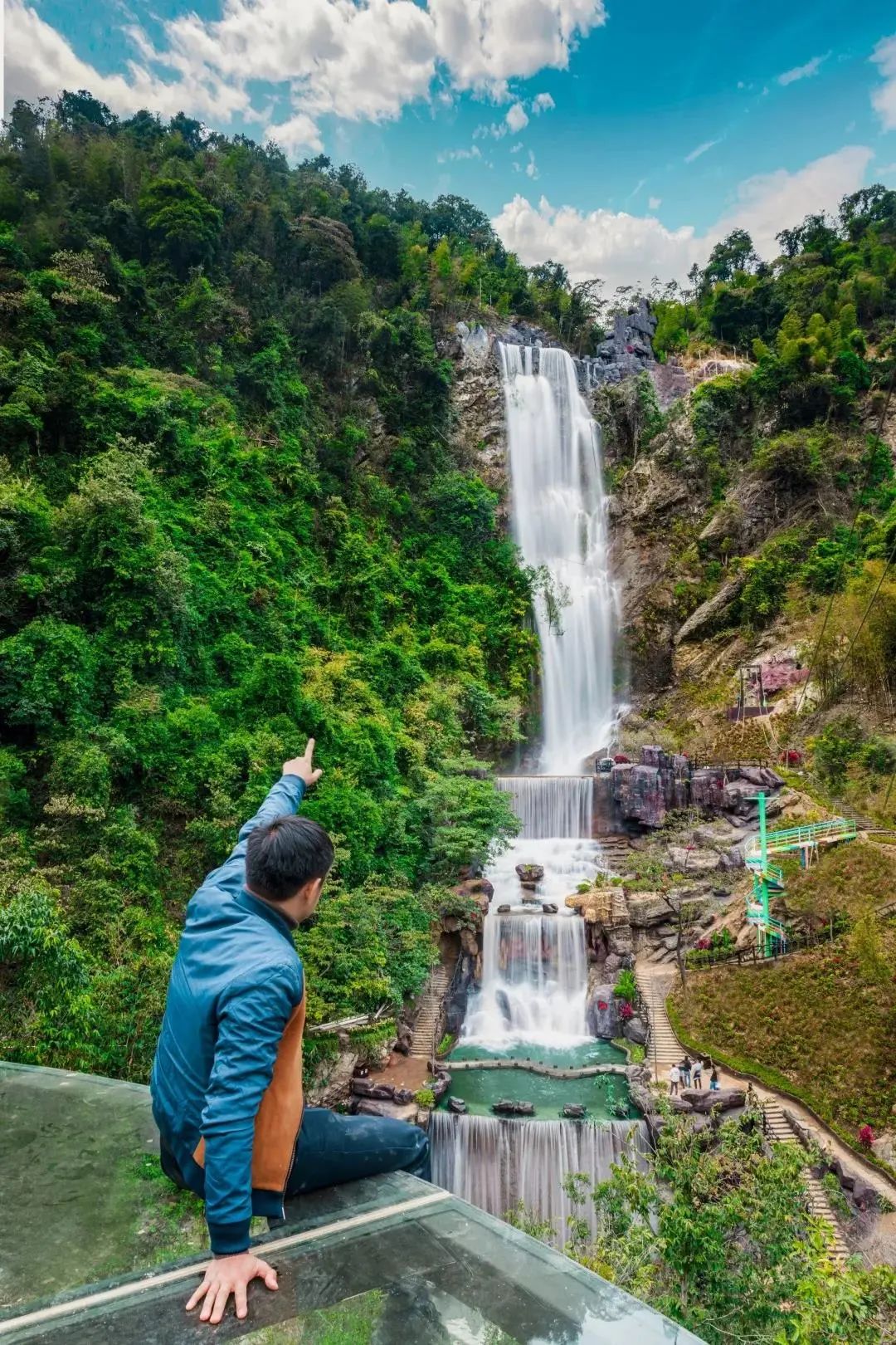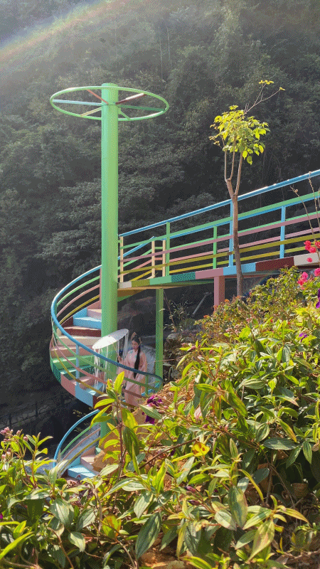 登上瀑布旁的七彩旋转楼梯