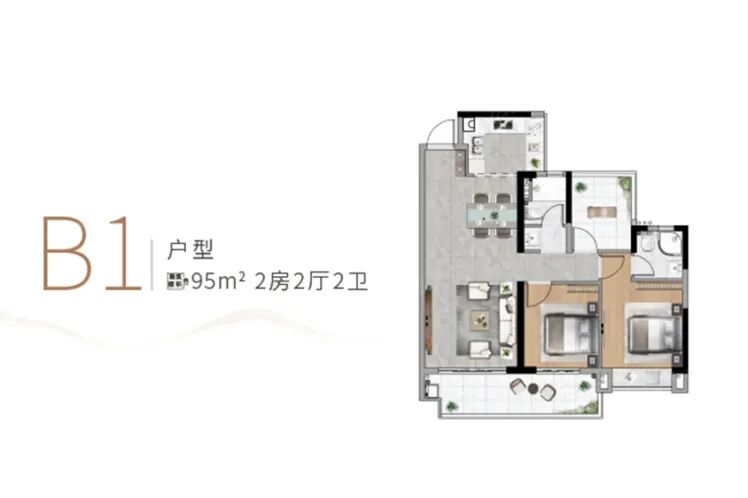 同样也是竖厅设计,建面约95㎡的2+1房2厅2卫户型,格局方正,自带6.5米朝南阳台,采光很不错。